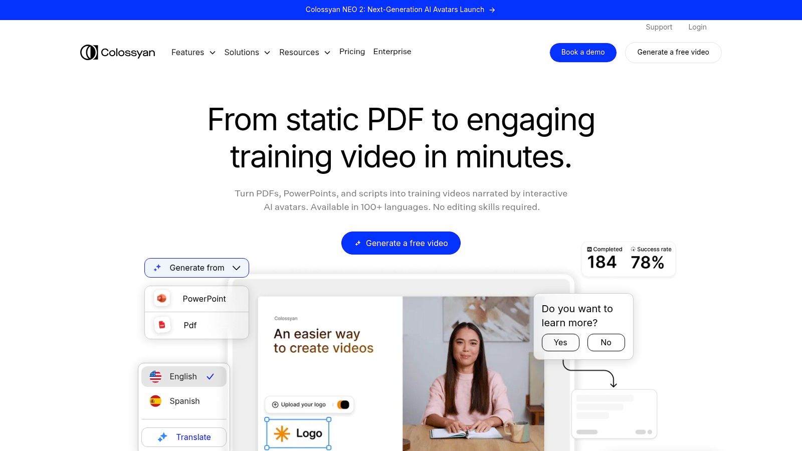 ColossyanPresenter avatars, templates, subtitles, hosting & PPT import★★★★💰 Enterprise-focused plans with hosting & templates👥 L&D teams, training & enterprise comms✨ Training-oriented workflows, screen recording & hosting