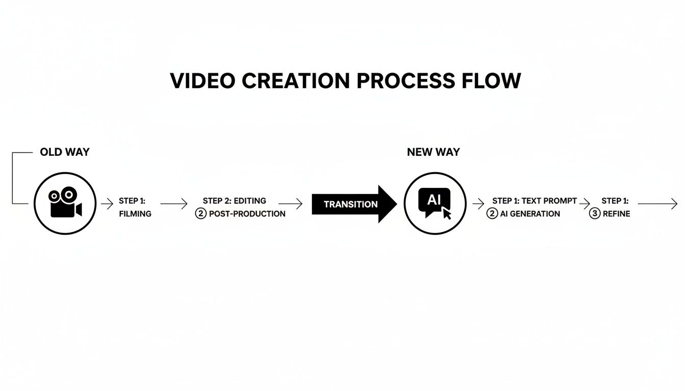 Flowchart comparing the old way of video creation (filming, editing) with the new AI-driven process (text prompt, AI generation, refine).
