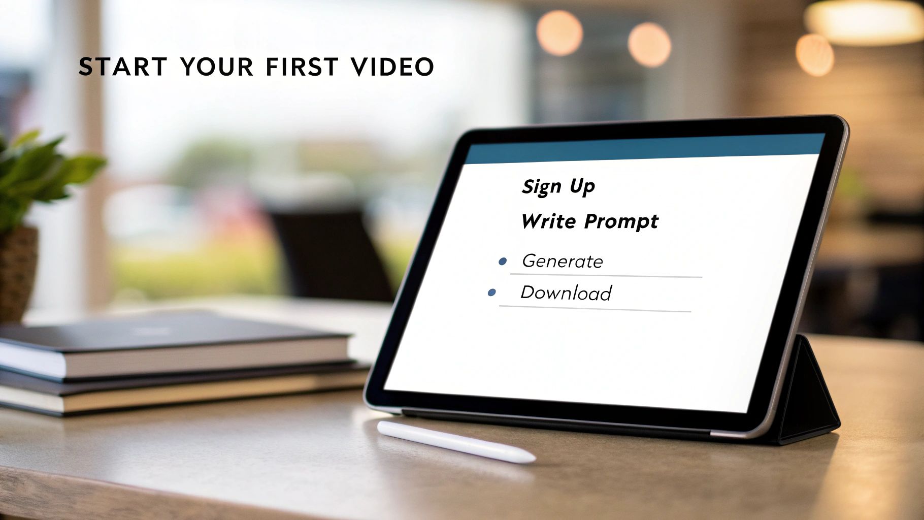 A tablet displays steps to sign up, write a prompt, generate, and download a video.