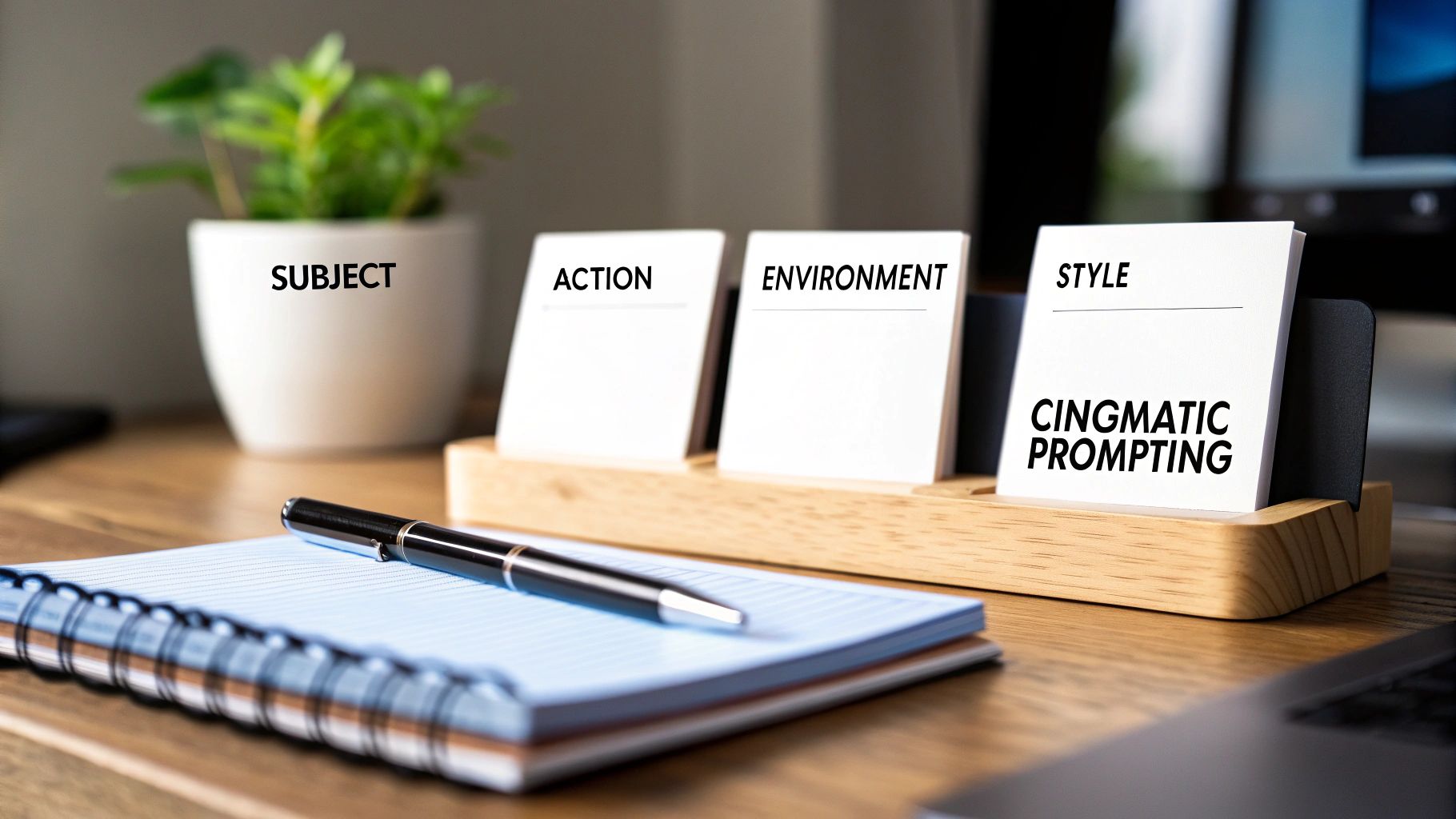 Desk setup with cards for AI prompting, labeled Subject, Action, Environment, and Style.