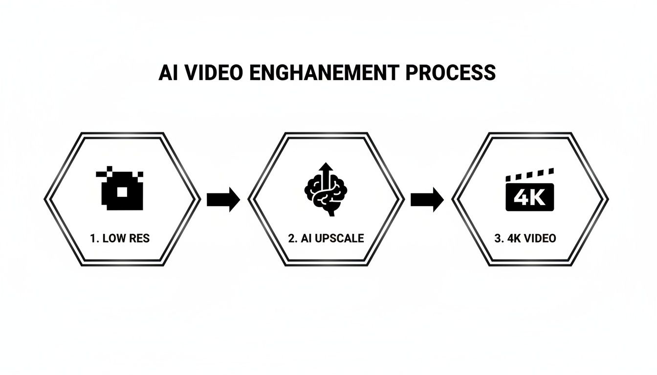 A diagram showing the AI video enhancement process: low resolution input, AI upscaling, resulting in 4K video.